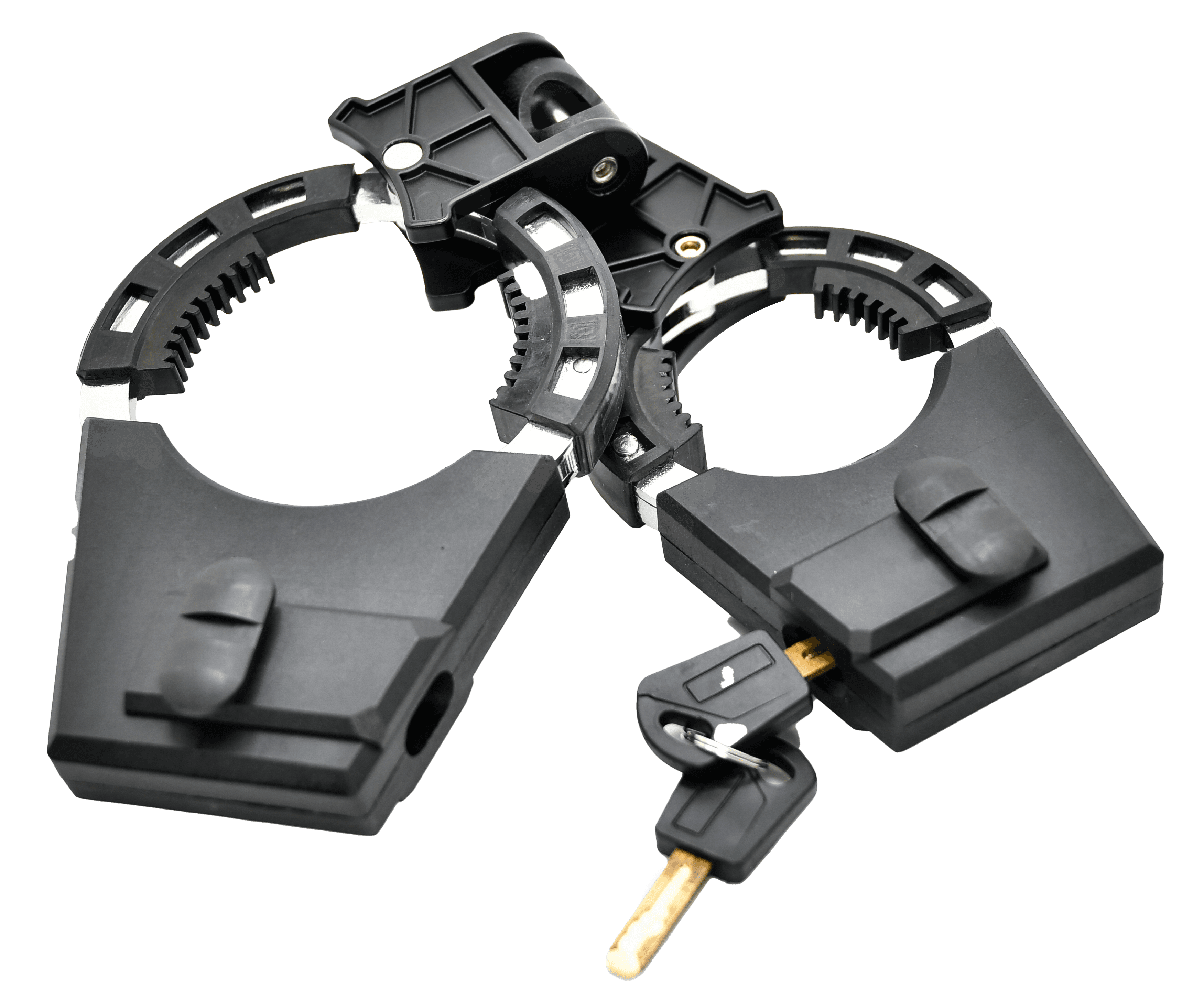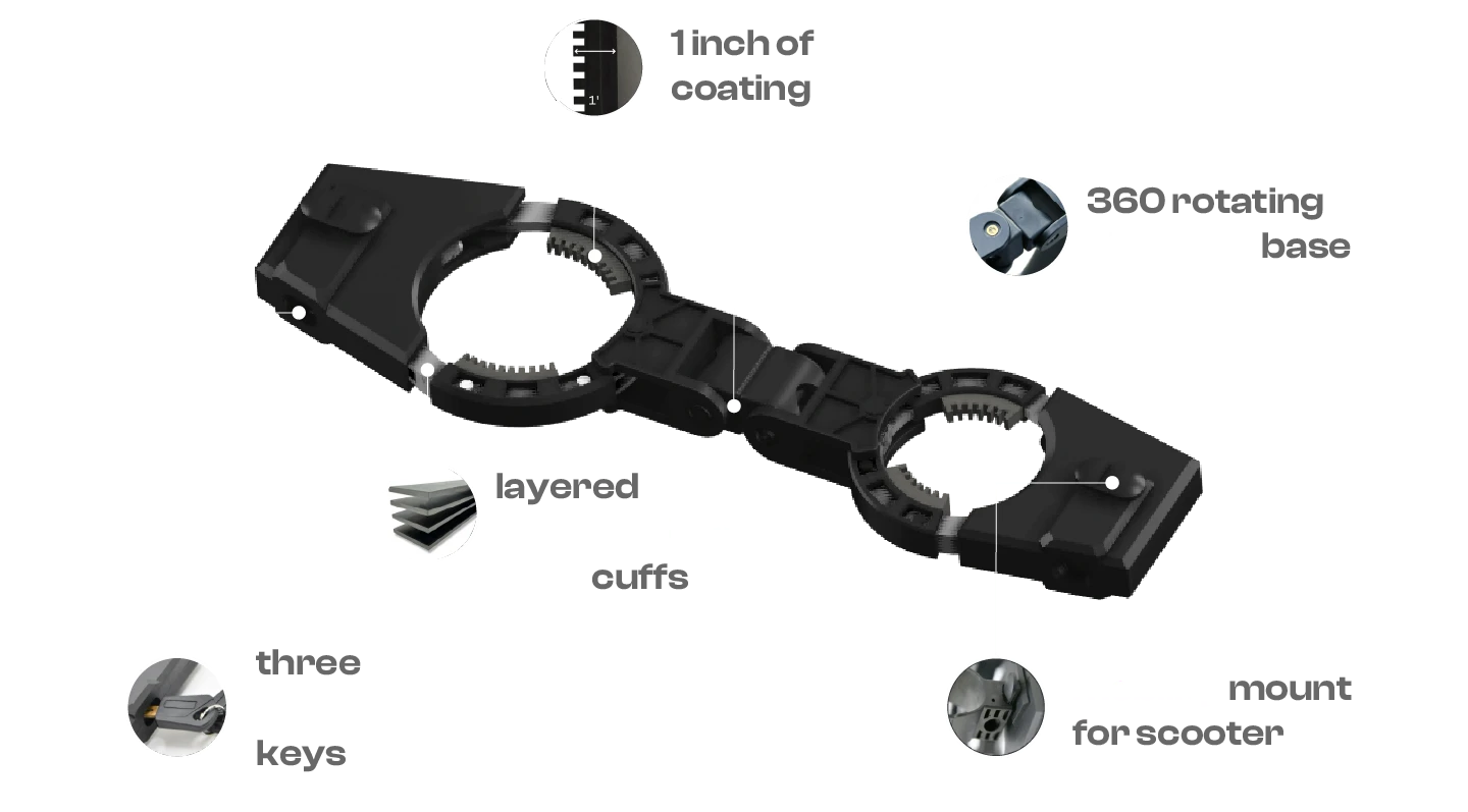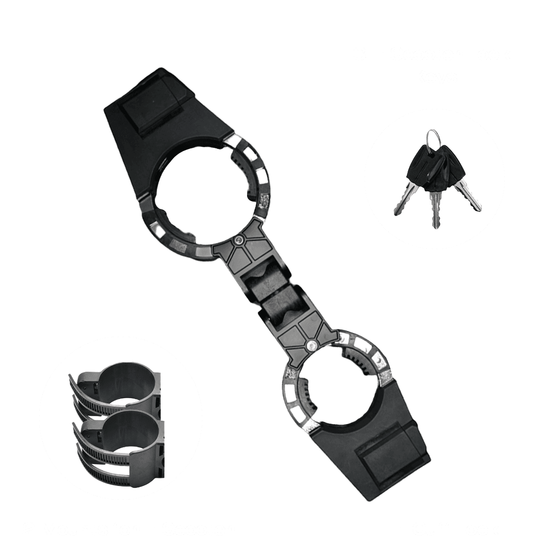 The E-Cuffs 1.0 is our first product—a high-security, dual-claw E-Scooter lock designed for both scooter and pole attachment. Made from carbon steel, aluminum and zinc alloys, and reinforced nylon, it offers superior strength and durability. A soft foam scooter grip and rubberized pole lock ensure user comfort, while its 3000+ lbs tension force outperforms most bike locks. With Premium materials, ergonomic design, and three high-quality keys, E-Cuffs 1.0 sets a new standard for E-Scooter security.